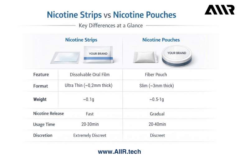 Nicotine strips and nicotine pouches are two popular smoke-free nicotine products, but they differ significantly in technology, user experience, and nicotine delivery. This guide explains how nicotine strips (dissolvable oral films) compare with nicotine pouches (fiber sachets), covering manufacturing methods, usage duration, flavor potential, and market trends to help brands and distributors understand which format best fits their business strategy.